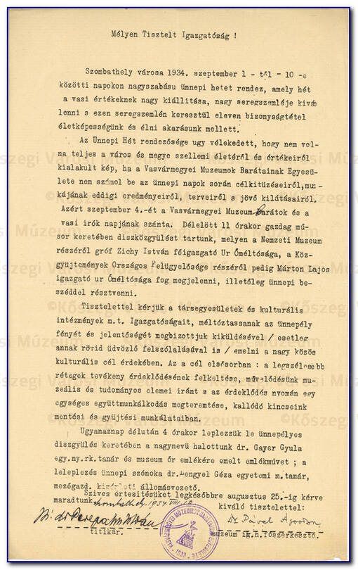 Levél, Tárgya: Szombathely 1934. szeptember 1-10-ig tartó ünnepsége |