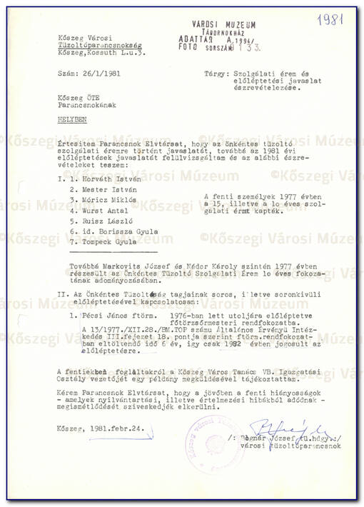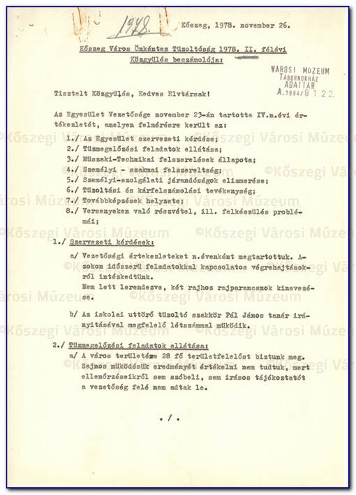 A Kőszegi Önkéntes Tűzoltó Egylet Közgyűlési beszámoló,ja 1980. I. és II. félév |